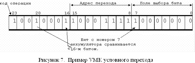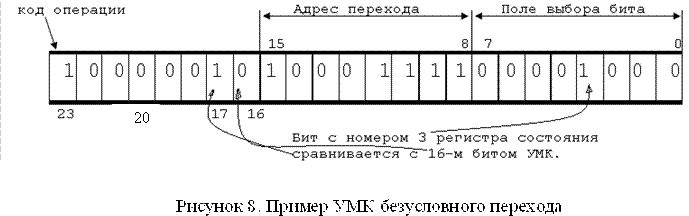 Для организации безусловного перехода используется 3-й бит регистра состояния, содержащий константу 0. Сравнение этого разряда с константой 0 в 16-ом разряде УМК, всегда дает положительный результат и позволяет переслать в СчМК нужный адрес перехода. Формат МК показан ниже на рисунке 8.
