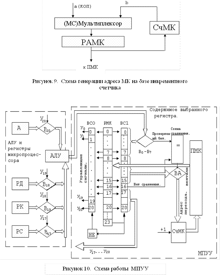 Микропрограммное устройство управления МПУУ представляет собой простую интерпретирующую машину. Структура МПУУ схожа со структурой МП. Однако типов МК всего два и МПУУ есть очень простая ЭВМ. Схема работы МПУУ показана на рисунке 10.
