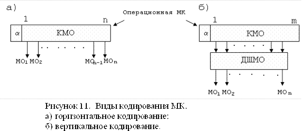 В горизонтальных МК каждый бит управляет одной вентильной схемой. Микрокоманда с одним битом, приходящимся на одну вентильную схему, имеет горизонтальное кодирование. Единицы и нули, содержащиеся в МК, непосредственно поступают на ключевые элементы. Однако число вентильных схем может быть большим и горизонтальная МК окажется неприемлемо длинной. Такие МК требуют для своего хранения большой разрядности ПМК, что является основным недостатком горизонтального типа кодирования МК. Однако при горизонтальном кодировании МПУУ обладает большим быстродействием.