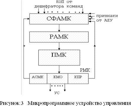 Микропрограммы хранятся в памяти микрокоманд ПМК. СФАМК- схема формирования адреса микрокоманды. РАМК - регистр адреса микрокоманды. РМК - регистр микрокоманд.