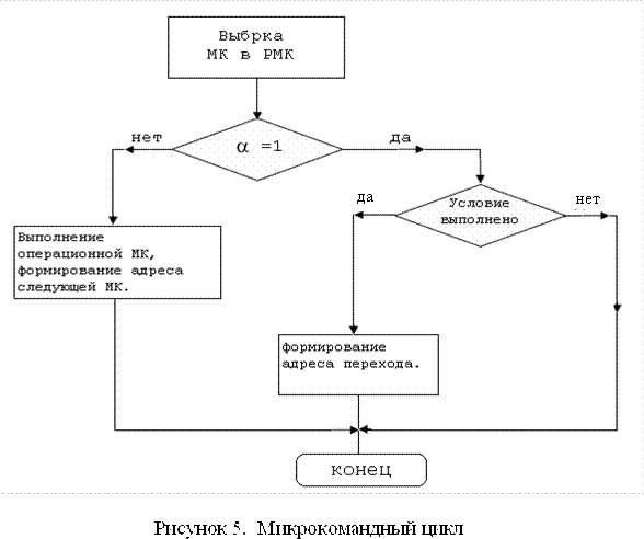 Управляющие МК используются для изменения последовательности выполнения МК в зависимости от тех или иных условий. Иными словами, для выполнения условных и безусловных переходов в микропрограмме используются УМК, содержащие адрес перехода и поле признаков. На рисунке 5 показан алгоритм выполнения микрокоманды в МПУУ.