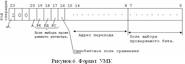 Каждая УМК производит проверку лишь одного из битов заданного регистра. Каждая управляющая МК определяет 1 бит подлежащий проверке. Если выбранный бит и 16-й бит микрокоманды совпадают, то последовательность МК, подлежащих исполнению, изменяется и адрес следующей МК определяется битами с 8 по 15 самой УМК. Бит, который требуется проверить, определяется двумя полями МК: полем битов от 0 до 7 и от 17 до 20. Биты от 0 до 7 указывают, какой бит выбранного регистра подлежит проверке. Таким образом, только один бит с 0 по 7, и один бит с 17 по 20 должны быть равны единице.