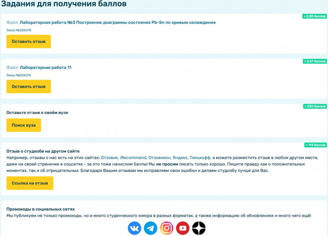 Процент считается от суммы покупки или других показателей. Например, за отзыв о студизбе можно получить от 50 до 100 баллов. За отзыв о купленной за 500 рублей студенческую работу можно получить от 25 до 50 баллов.