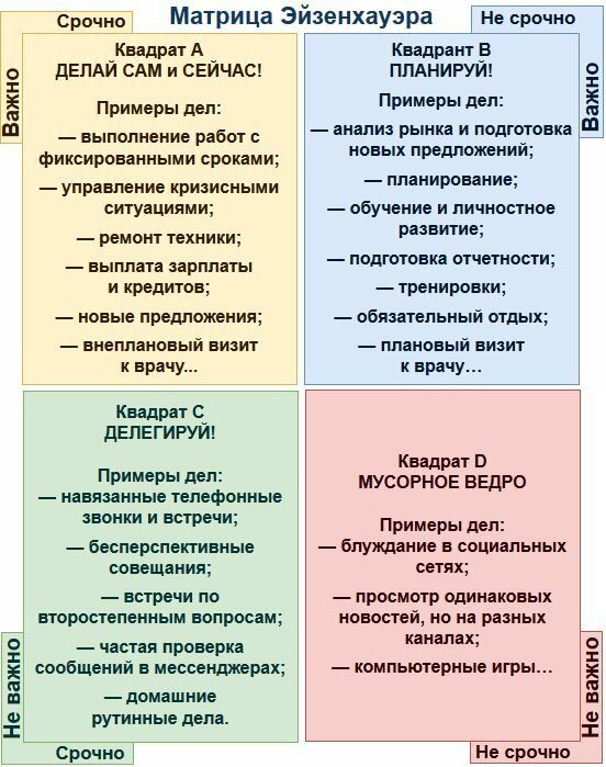После них на очереди «важные, несрочные». Сюда относятся дела, которые со временем станут срочными, но будут трудновыполнимыми. Тогда на них понадобится в разы больше сил и времени. Чтобы такое не произошло, под них нужно предусмотреть время.