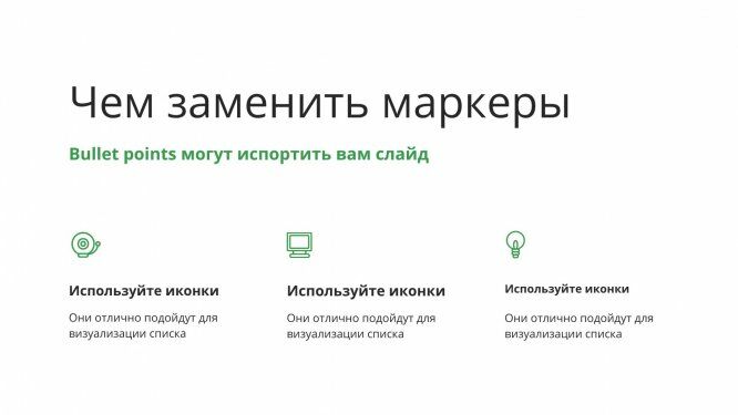 • Не используйте большое количество bullet points. Мы привыкли активно использовать маркеры, чтобы визуально выделить список или пронумеровать список. Если с этим переборщить, то ваш слайд превратится в решето;