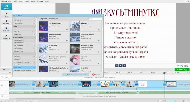 Загрузите музыкальное сопровождение: раздел «Файлы» → «Добавить аудиофайлы» Можно импортировать музыку с жесткого диска или из готовой коллекции, где в основном представлены инструментальные фоновые композиции. Например, мы взяли трек в быстром темпе для оформления физкультминутки в середине урока.![]()