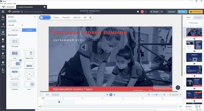 Интерфейс англоязычный, но разобраться в управлении несложно. Инструменты расположены на панели быстрого доступа и визуализированы. В каталоге есть множество готовых шаблонов разной тематики. Создавать презентации можно на основе конструктора, встраивая в слайд-шоу анимацию, изображения, видео, текст и инфографику. Для удобства работы макеты удобно рассортированы в каталоге по тематике и стилю оформления.