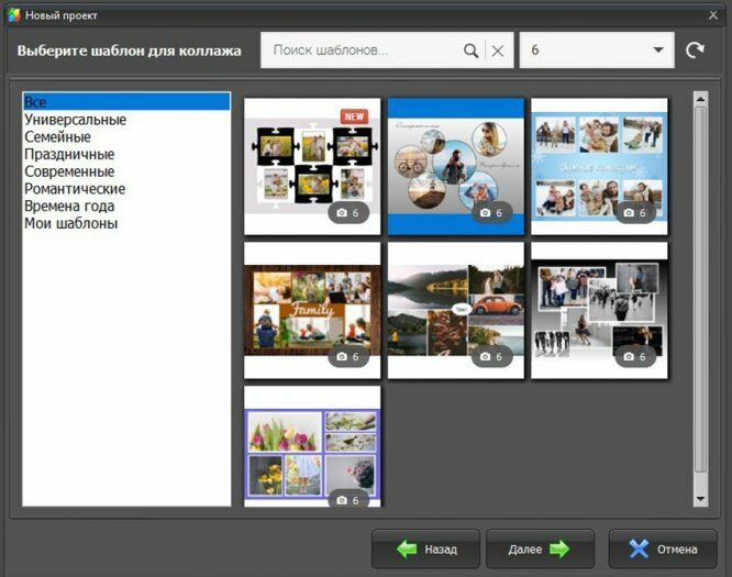 В стартовом окне нажмите «Новый проект». Затем кликните на «Шаблоны коллажей» и подберите макет по тематике и подходящему числу фотографий.