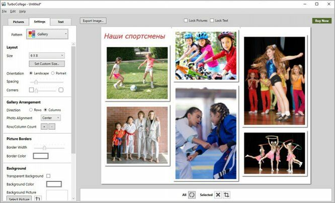 Несмотря на отсутствие в TurboCollage русского языка, пользователи без труда смогут разобраться, как сделать фотоколлаж на компьютере. Здесь можно создать композицию с помощью готовых шаблонов или по своему макету. Собрать коллаж из большого количества фото можно при помощи автоматического алгоритма — для этого нужно загрузить сразу все снимки и выбрать стиль оформления. Можно менять цвет фона, добавлять надписи, выделять картинки обводкой или тенью.