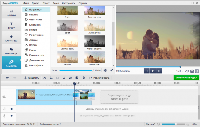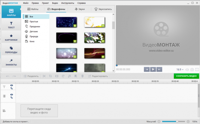 Современный и доступный инструмент для видеомонтажа. Поддерживает более 50 форматов, включая AVI, MP4, MOV и MKV. Позволяет вставлять в проекты видео, фотографии, музыку и надписи. Каталог футажей содержит разнообразные видеофоны, которые можно наложить на хромакей.