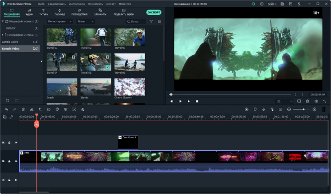 Программа для видеомонтажа для начинающих, где есть все необходимое для работы: обрезка, конвертация, вставка аудиодорожек и так далее. Еще есть встроенные функции цветокоррекции, стабилизации и коррекции звука. Filmora также поддерживает работу с различными форматами видео и аудио.