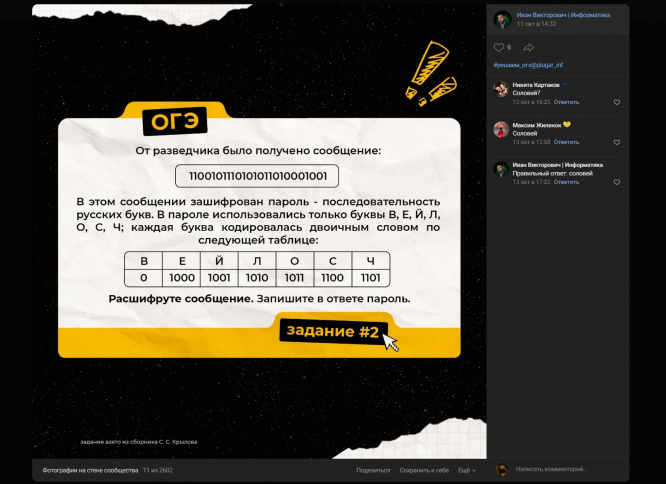 Паблик репетитора по информатике. Здесь публикуются шутки про учебу, интересные факты о предмете, разбираются задачки к ЕГЭ и ОГЭ. Иван Викторович объясняет сложные темы простым языком, делая подготовку к экзаменам доступной и эффективной. Также в комментариях к задачам участники сообщества часто предлагают свои решения, благодаря чему можно проанализировать несколько вариантов достижения желаемого результата.