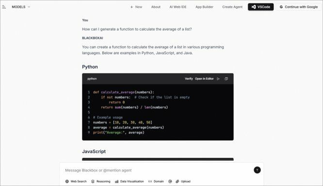 BlackBox — это чат-бот на основе AI-технологий, который поможет освоить азы программирования. Он знает более 20 языков — Python, JavaScript, TypeScript, Ruby и другие. Умеет выявлять проблемы и исправлять код, находить в сети готовые решения под вашу задачу, разъяснить конкретную функцию и принцип ее действия. С AI-ботом можно общаться — задавайте вопросы о вашем коде, и нейросеть выскажет мнение, предложит альтернативный выход.