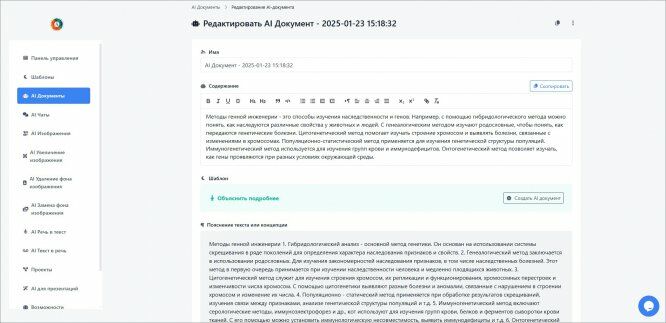 Кроме этого сервис позволяет сделать перевод, транскрибировать аудиофайлы (до 10 МБ), извлечь ключевые тезисы. Не смогли самостоятельно разобраться в материале — попросите AI-ассистента объяснить подробнее. ИИ перескажет содержание с использованием упрощенной терминологии, останавливаясь на сложных моментах. В платных пакетах, помимо работы с текстом, добавляется возможность генерации и редактирования изображений, создания презентаций.