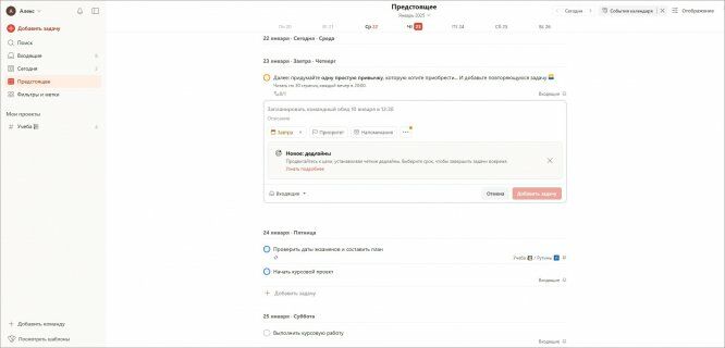 Сервис-планировщик с элементами искусственного интеллекта. Больше не нужно держать в голове список дел. AI-ассистент не только будет напоминать вам о текущих задачах, но и поможет расставить приоритеты. Укажите ваши привычки, и нейросеть подскажет, как организовать свое время. Составляйте планы на день, неделю и месяц, отслеживайте свою продуктивность. Todoist можно использовать в одиночку или в команде. На платформе можно создавать канбан-доски с задачами, отслеживать их выполнение, общаться с участниками проекта.