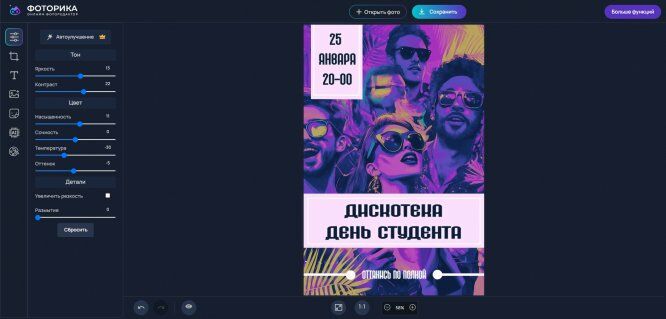 AI-фоторедактор поможет решить любые задачи, связанные с созданием визуальном контента — подготовить картинки для презентации, сделать афишу для праздника, обработать фотографии с мероприятий, собрать коллаж. Здесь можно быстро отрегулировать яркость и контрастность, настроить резкость, обрезать и повернуть картинку, сделать цветокоррекцию. Кроме этого онлайн-сервис оснащен интеллектуальными инструментами: воспользуйтесь ИИ-удалением фона или функцией «Умный кроп», чтобы выбрать оптимальный вариант кадрирования с учетом правил композиции.