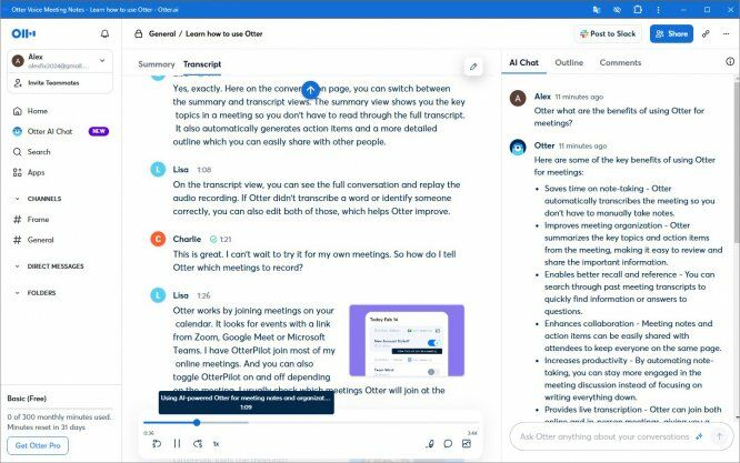 Если лекции и вебинары проходят на английском, французском или испанском, во время занятия вы сможете не отвлекаться на запись конспекта — этим займется Otter Pilot, ваш виртуальный ассистент. Он автоматически определяет спикера, транскрибирует речь в текст, а по окончанию занятия сформулирует краткое резюме. Во время встречи работает AI-чат, в котором можно оставлять комментарии или задавать вопросы по теме, в том числе на русском. AI-ассистент также умеет находить по запросу информацию из предыдущих протоколов.