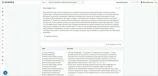 Эта платформа поможет найти материалы для написания исследовательских, курсовых и дипломных работ. Нейросеть имеет доступ к библиотеке научной литературы и при этом не только проводит поиск по ключевым словам, а понимает смысл исследования. Она предлагает концептуально-связанные материалы, реальные статьи (в виде PDF-файлов), а не упоминания о работах. AI-ассистент также учитывает актуальность данных, их цитируемость, известность авторов,