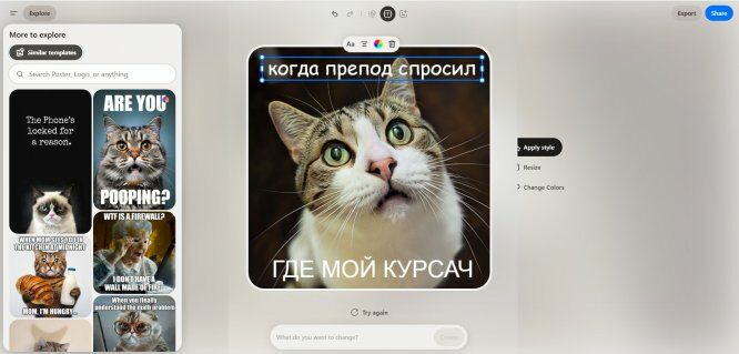 Генеративная нейросеть предлагает широкие возможности для творчества и развлечений. Здесь можно создавать мемы, логотипы, обои для ПК и смартфона, принты для футболок, кружек и многое другое. Загружайте свои изображения в качестве референса или используйте готовые шаблоны, изменяйте стиль и цветовую гамму, удаляйте и добавляйте объекты, вставляйте надписи. Вы также можете использовать простые текстовые подсказки, чтобы получить более точный результат генерации.