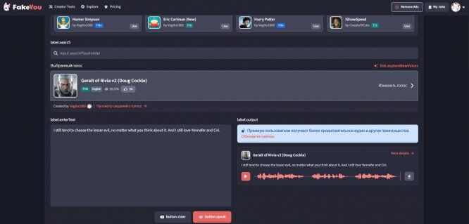 Хотите разыграть друзей или записать необычное поздравление? Поможет оригинальный сервис для создания голосовых дипфейков. Выберите героя фильма и компьютерной игры, и запишите от его имени аудиосообщение, измените свой тембр или создайте уникального персонажа. Правда, сервис рассчитан на англоязычную аудиторию. Если хотите, чтобы ваш герой говорил по-русски, набирайте текст в транслите.