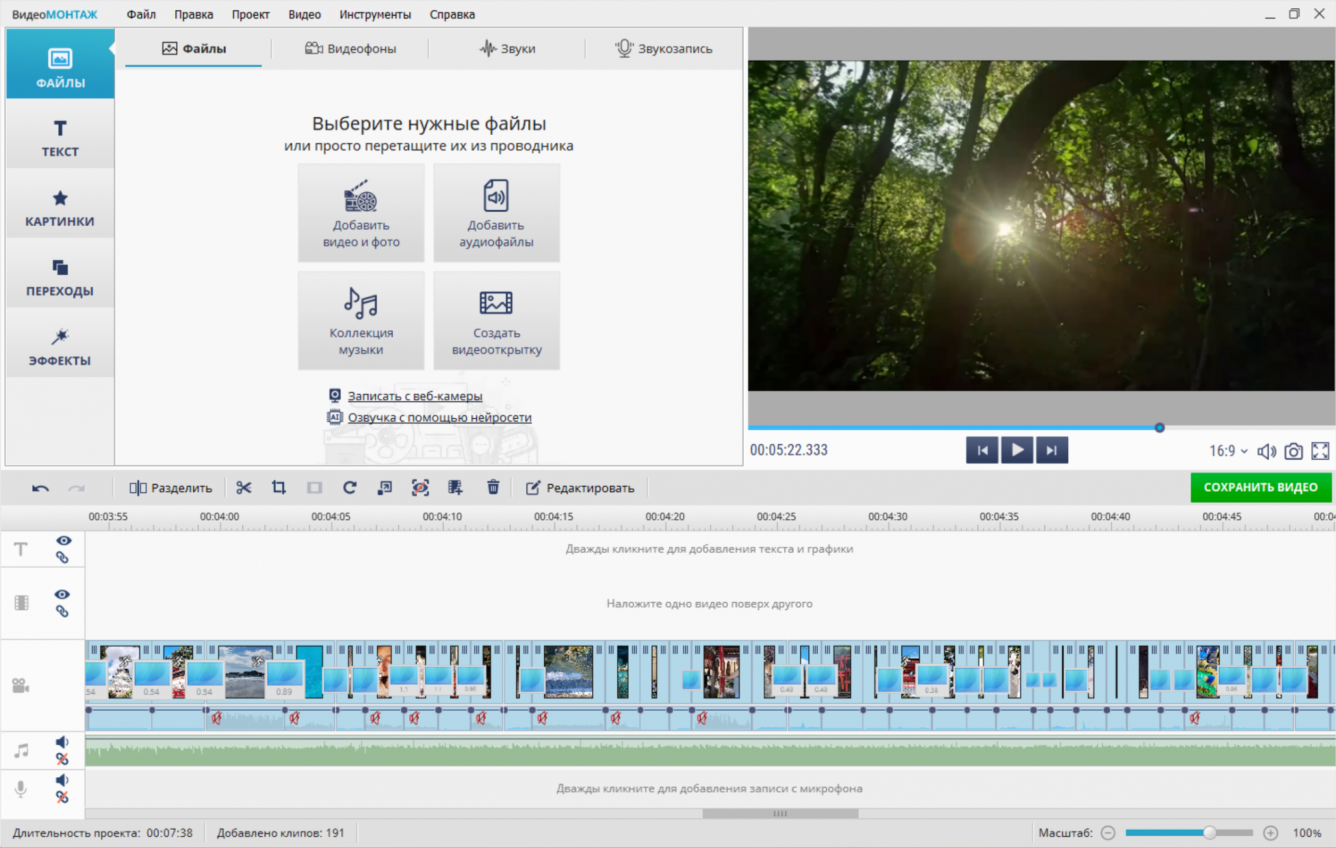ВидеоМОНТАЖ — русскоязычная программа с простым интерфейсом. Подходит для тех, кто боится сложных панелей и настроек. Позволяет быстро склеивать ролики, добавлять музыку, переходы и даже субтитры. Разработчики предусмотрели и обучение всем фишкам ПО.