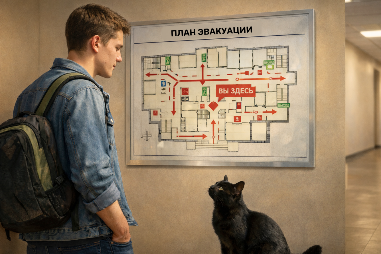 Пожар или обрушение в вузе случаются редко, но когда случаются — счёт идёт на секунды. Ты уже сделал первый шаг — прочитал эту статью. Второй шаг — посмотреть на планы эвакуации в своём корпусе. Третий — запомнить номера 101 и 112. Это займёт 10 минут, но может спасти жизнь.