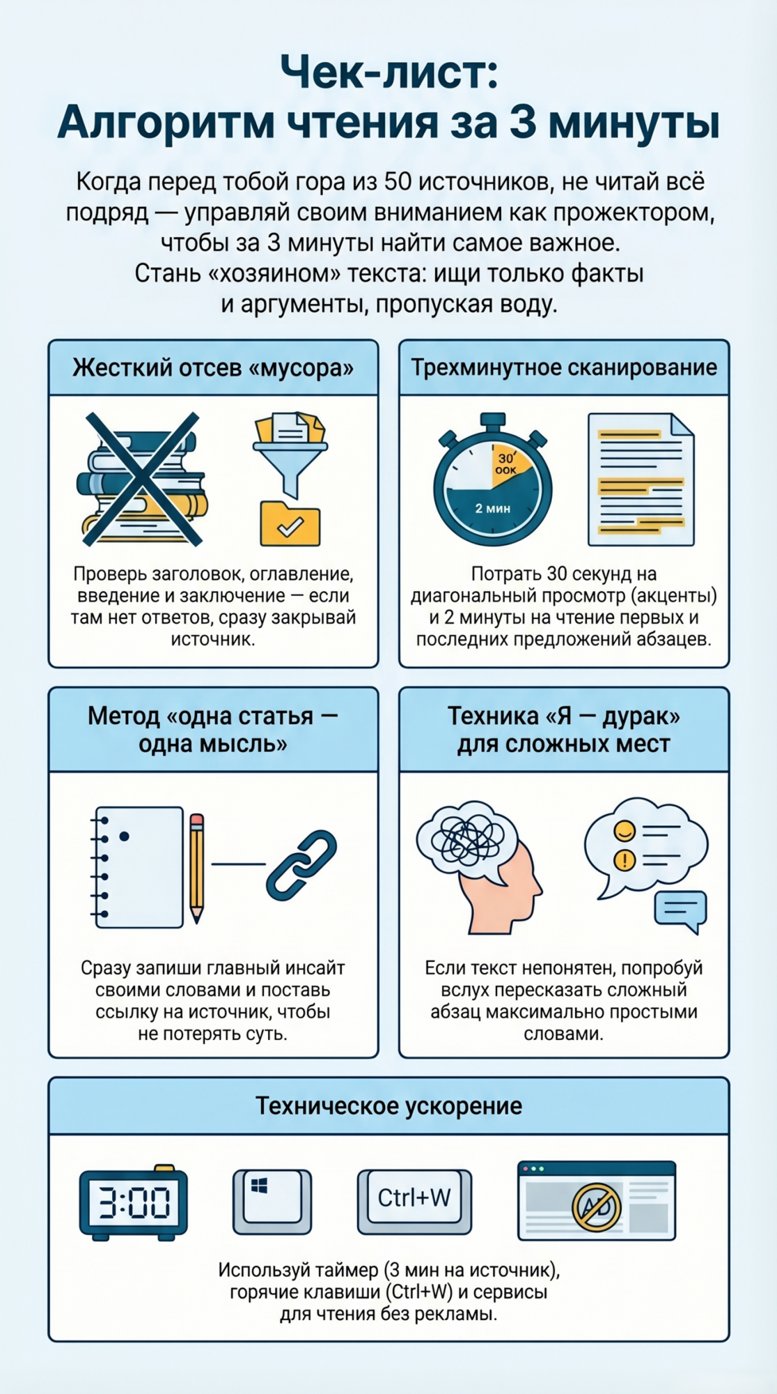 | Выборочное чтение | Читаем только введение/выводы и заголовки разделов. | Очень быстро | 80% сути |