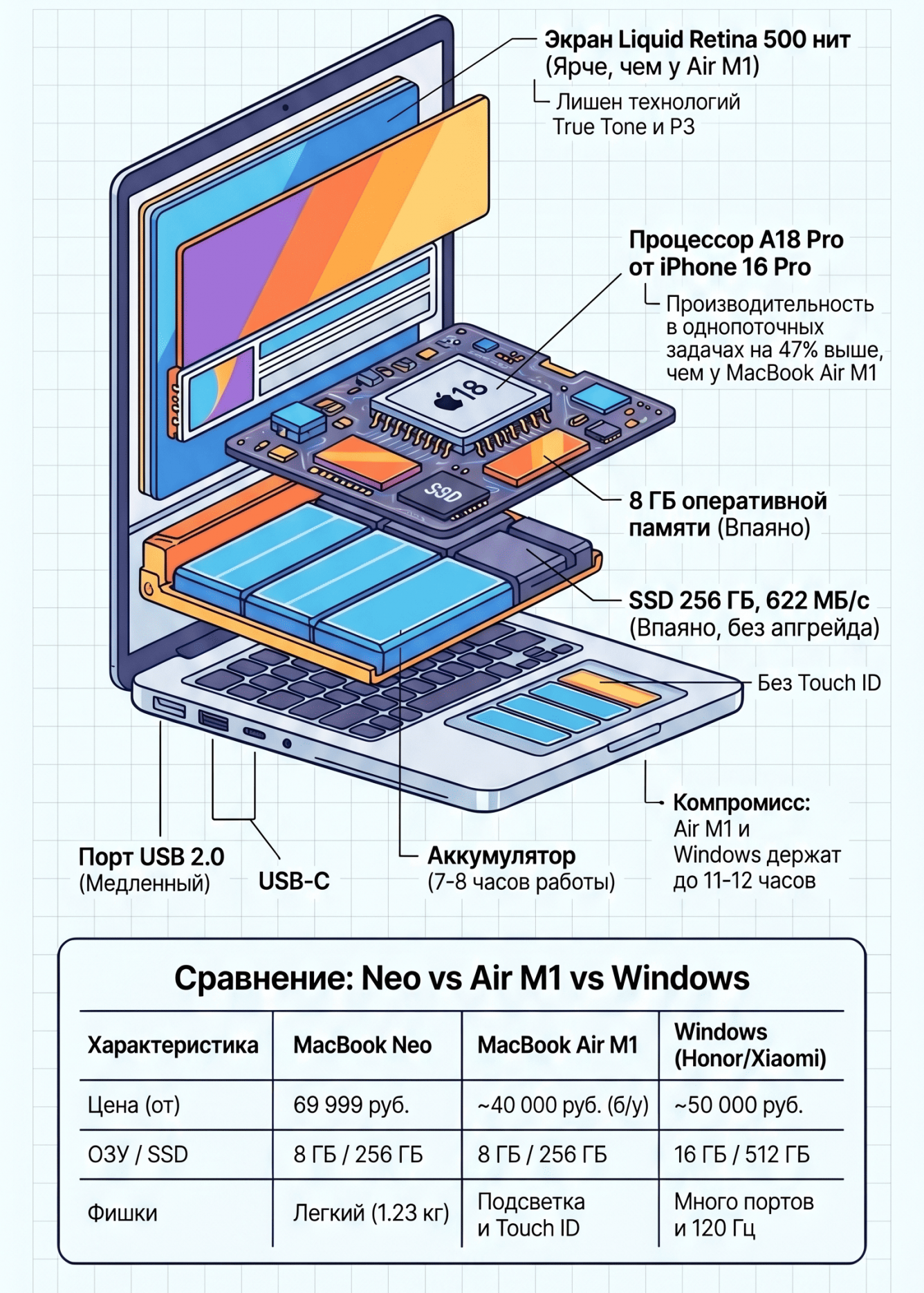 Вот ключевые характеристики MacBook Neo: