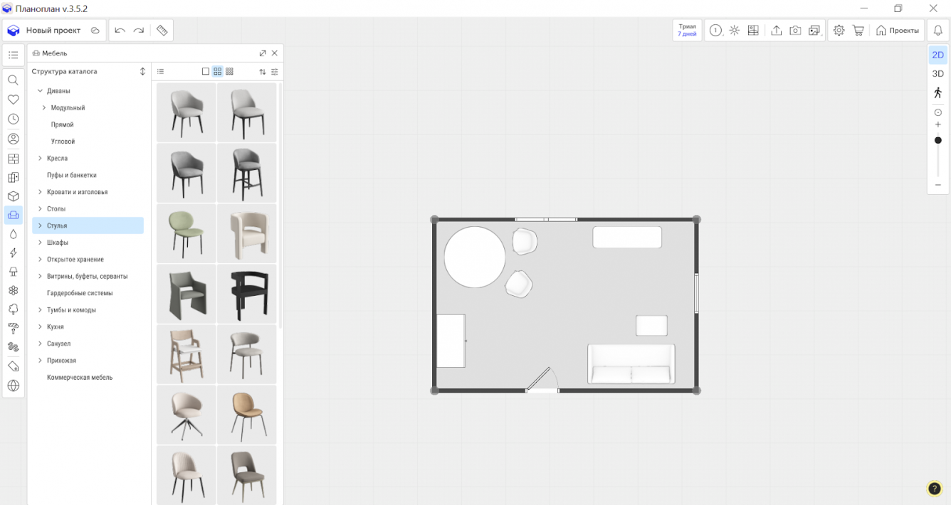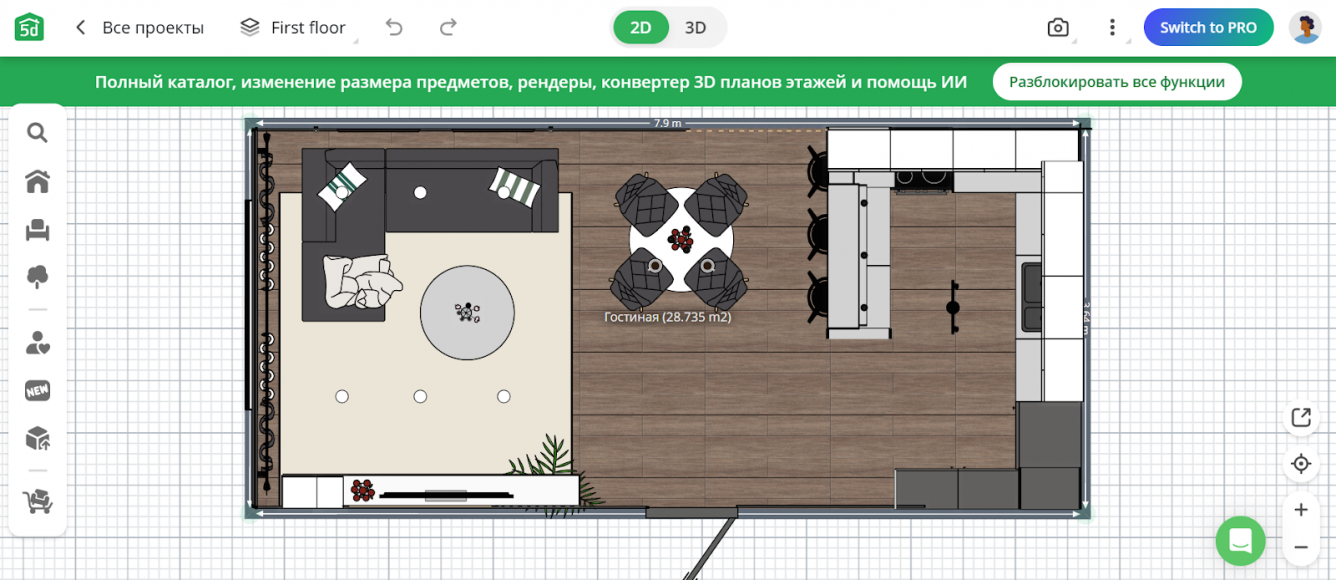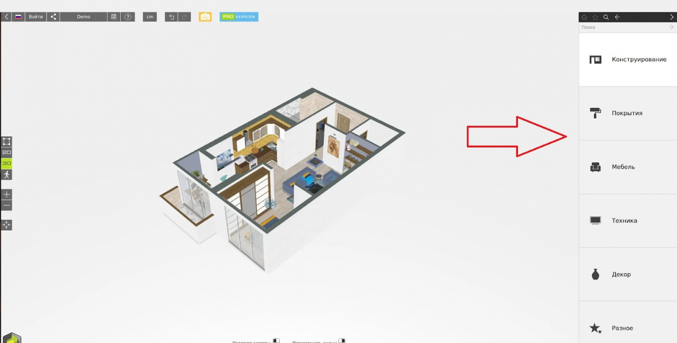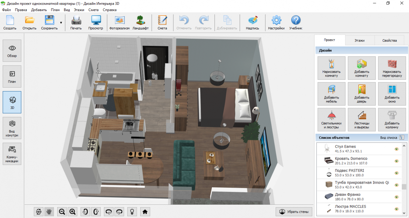 Для каких целей подойдет: если нужен несложный, но эффектный дизайн-проект. В бесплатной версии нет многих видов мебели, декора и даже перегородок, но базовых элементов может быть достаточно.