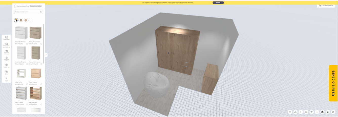 Специализированный онлайн-конструктор от известного бренда, ориентированный на проектирование систем хранения и корпусной мебели. Все элементы автоматически привязываются к стенам и корректно поворачиваются в углах.