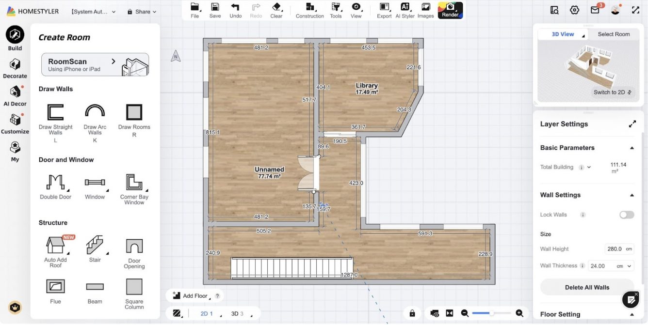 Онлайн-платформа и десктопное приложение для создания проектов в 2D и 3D. Позволяет строить планировки любой сложности, добавлять технику, изменять текстуры и освещение. Есть AI-инструменты, которые предлагают варианты оформления по стилю. Чтобы получить рекомендации от ИИ, нужно просто отправить несколько фотографий квартиры и указать свои пожелания.