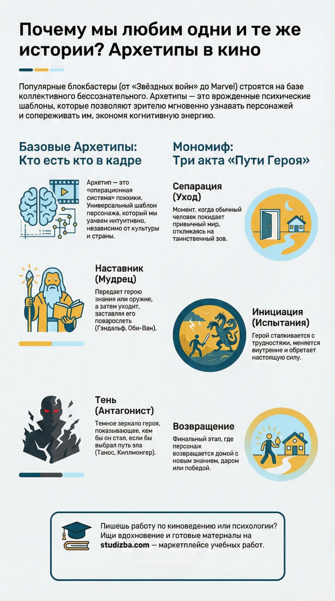 Это знание пригодится не только на экзаменах по киноведению, культурологии и маркетингу. Оно помогает глубже понимать культуру, в которой мы живём, и даже создавать свои истории. А если захочешь написать курсовую по этой теме — на СтудИзбе полно готовых работ, где разобраны архетипы в творчестве Тарантино, Marvel или советском кино. И да, свои старые работы тоже можно выложить — вдруг твой анализ «Джокера» поможет кому-то на экзамене.