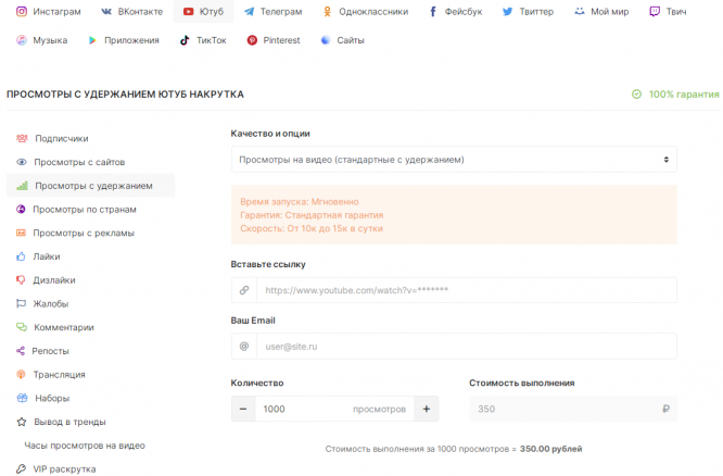 - Быстрая "доставка" просмотров (вплоть до 100000 в сутки);