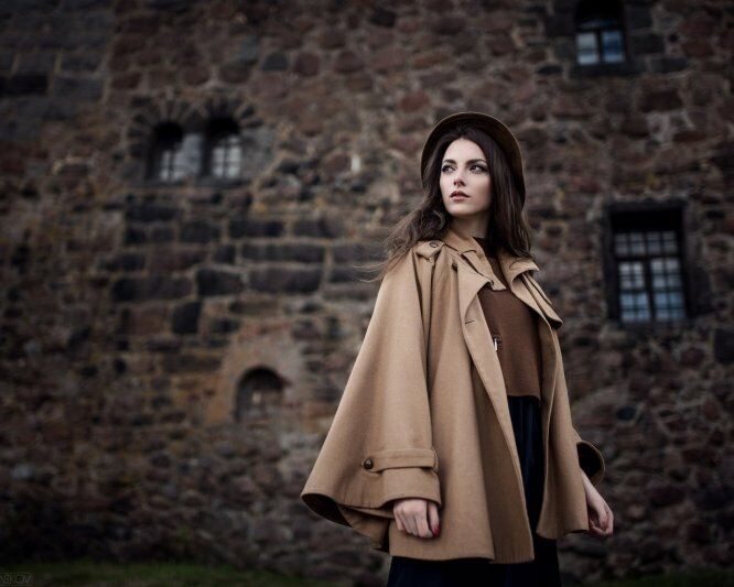 Кейп – смотрится эффектно за счет свободного кроя, отсутствия рукавов и схожести с накидкой английских рыцарей. Интересные сеты получаются с зауженными брюками и высокими ботфортами.