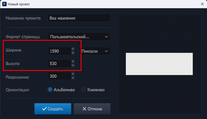 Укажите размеры ширины и высоты, а также ориентацию листа. Для обложки ВК есть установленные размеры: 1590х530.