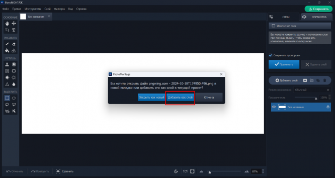 Когда при перетаскивании программа вас спросит, хотите ли вы открыть фото как новый документ или как новый слой, выберите вторую опцию.