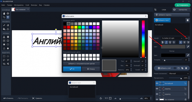 Из выпадающего списка подберите подходящий тип шрифта, укажите размер, цвет букв и контура. Также можно изменить толщину обводки, угол наклона слов.