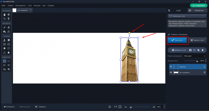 С помощью трансформирующей рамки придайте объекту нужное положение на холсте и размер. Для вращения воспользуйтесь желтой кнопкой сверху рамки, для растягивания – белыми точками. Затем нажмите «Применить».