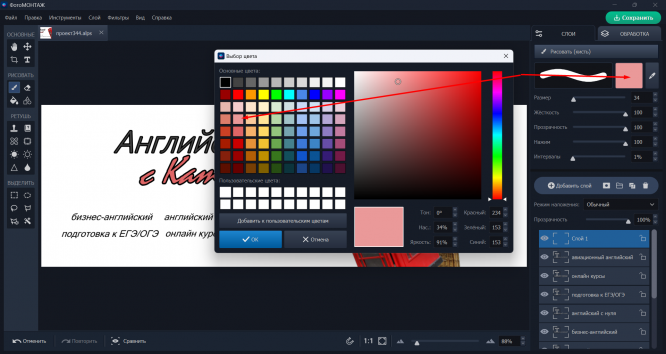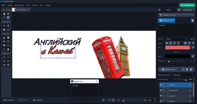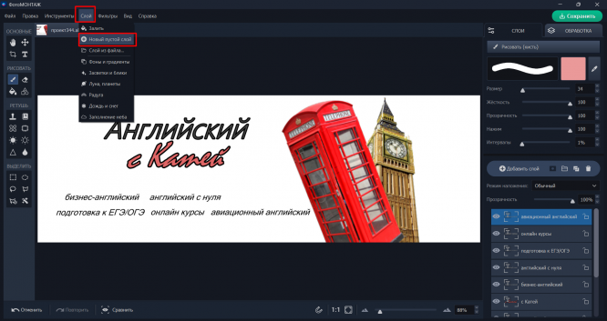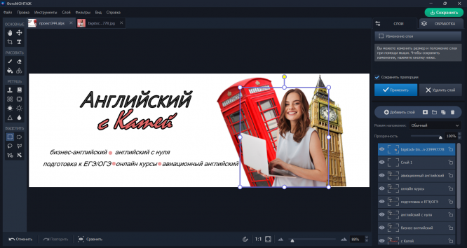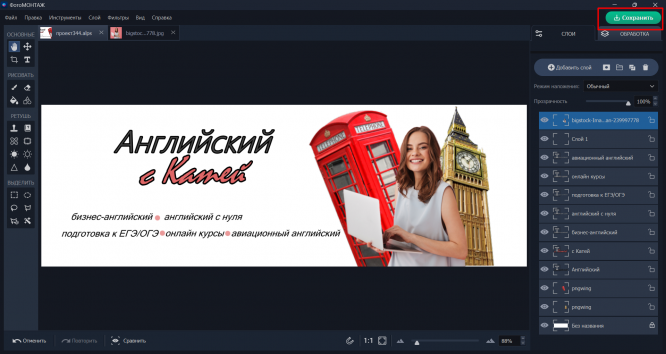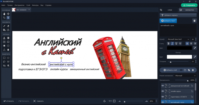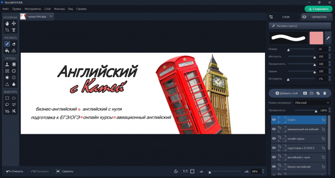 Например, русскоязычная программа, которая так и называется – ФотоМОНТАЖ. У нее интуитивно понятный интерфейс, удобная навигация, много автоматических и полуавтоматических функций. Из-за доступности и простоты ее предпочитают новички, но и опытные пользователи не будут разочарованы. В вашем распоряжении: слои, маски, профессиональные инструменты коррекции тона и света, много фильтров и полезных ручных настроек. С помощью ФотоМОНТАЖа мы наглядно продемонстрируем, как создать личный бренд, вернее его визуальную составляющую на примере обложки для группы в ВК репетитора по английскому языку.