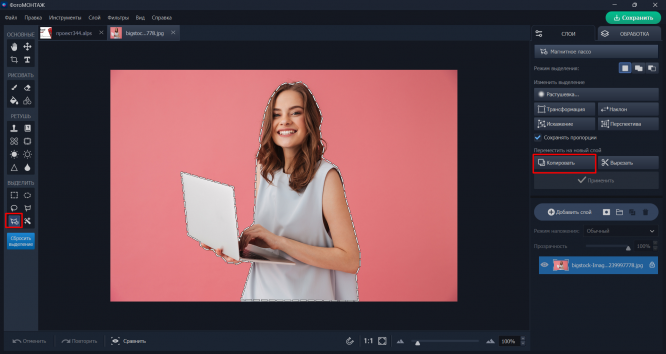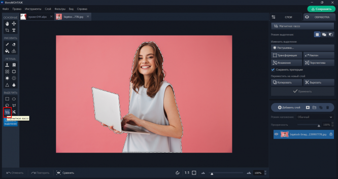 Она загрузится в новой вкладке. Возьмите любой удобный для вас инструмент выделения, например, «Магнитное лассо» и создайте обводку вокруг модели.