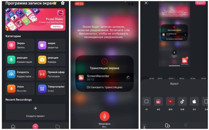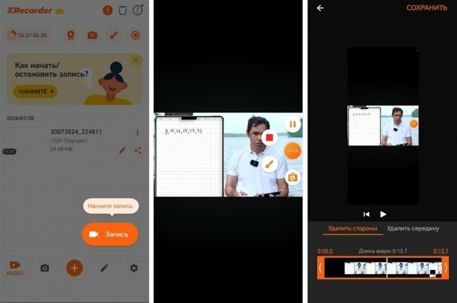 Это приложение-рекордер. Захватывает весь дисплей устройства, позволяет делать паузы и возобновлять процесс съемки. Аудио можно фиксировать с микрофона гаджета или из системы. ПО имеет встроенный видеоредактор для обрезки и соединения отснятых клипов. В нем настраивается громкость звука, добавить эффекты, сделать цветокоррекцию.