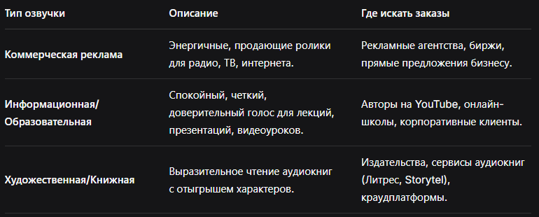 Начинайте с небольших заказов — озвучка сторис, коротких рекламных роликов для локального бизнеса, презентаций. Это даст опыт, портфолио и первые отзывы.