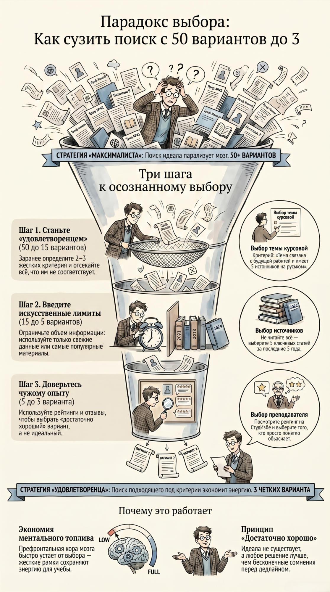 Изобилие выбора — это ловушка. Чем больше у нас свободы, тем больше мы боимся ею воспользоваться неправильно. Хорошая новость в том, что осознание этого парадокса уже снижает его власть над тобой. Не пытайся перебрать все варианты. Установи критерии, ограничь поле поиска и прими тот факт, что «достаточно хорошо» — это уже отлично. И помни: даже если ты ошибся с выбором, жизнь на этом не заканчивается. Пересдать экзамен или переписать курсовую можно, а вот вернуть нервы, потраченные на бесконечные сомнения, — нет.