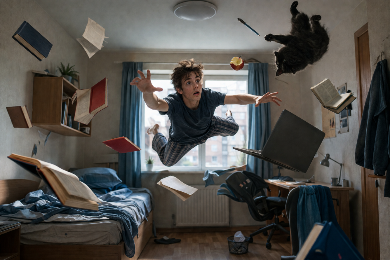 Лежа на диване, вы все равно падаете в искривленном пространстве-времени, но диван давит на вас снизу вверх, создавая знакомое чувство веса. Стоит убрать опору — и вы почувствуете невесомость. Именно это происходит с парашютистом в первые секунды прыжка: он движется по геодезической, и сила тяжести исчезает вовсе.