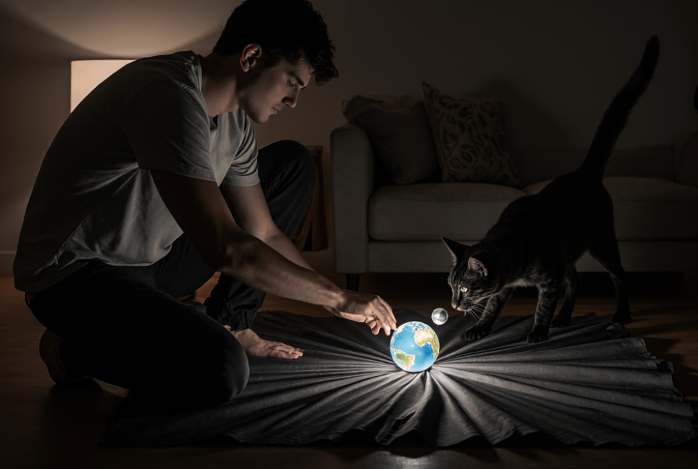 Представьте себе туго натянутый батут. Если положить в центр тяжелый шар для боулинга, он продавит ямку. Теперь бросьте туда теннисный мячик — он покатится к шару не потому, что шар его зовет, а потому что поверхность перестала быть ровной. Примерно так работает гравитация. Только «батут» — это не плоская поверхность, а все четырехмерное пространство-время. А шары — звезды, планеты и вы сами.