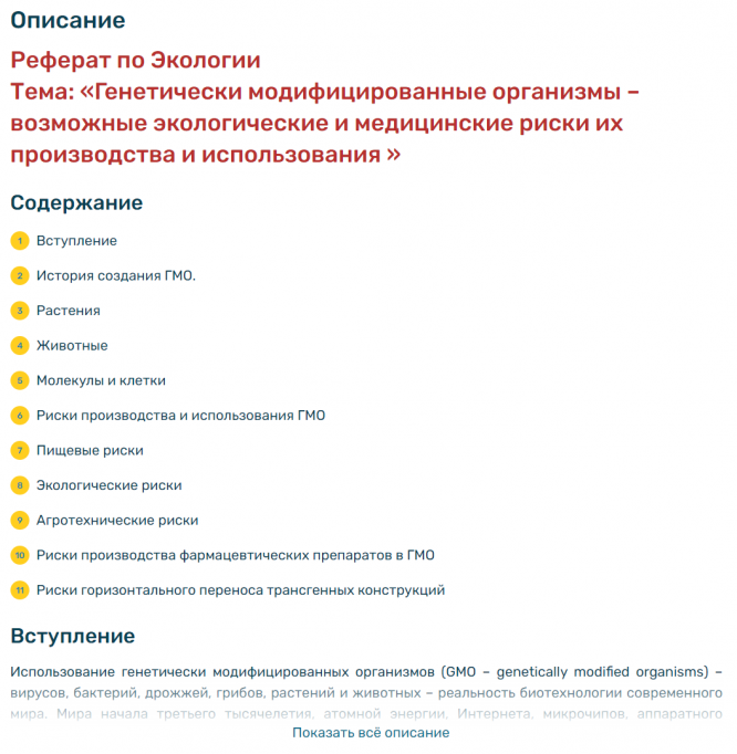 Хороший пример - https://studizba.com/files/ekologiya/abstract/241845-geneticheski-modificirovannye-organizmy-gmo.html