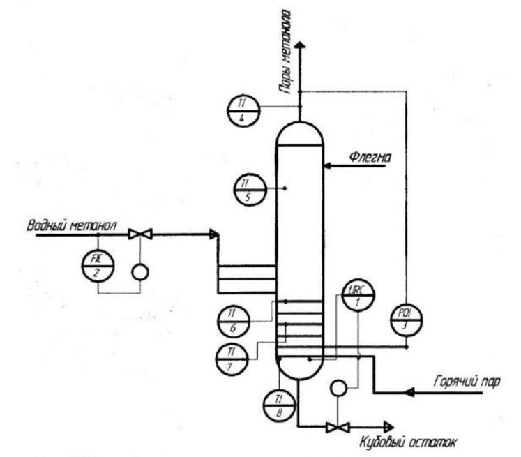 Предусмотрено: регулирование расхода водного метанола на колонну 259 ± 53 м³/ч (контур 1); регулирование уровня кубовой жидкости 1 ± 0,5 м в колонне путем отбора кубового остатка (контур 2); контроль перепада давления на колонне 0,008 ÷ 0,0165 МПа (контур 3); контроль температуры паров метанола на выходе из колонны не более 64 °С (контур 4); контроль температуры по высоте колонны 0 ÷ 100 °С (контуры 5, 6, 7, 8).