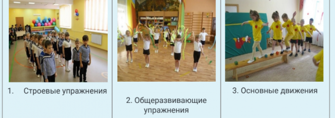 Физкультурные занятия — основная форма организованного систематического обучения физическим упражнениям. Физкультурное занятие в ДОУ является трёхчастным (состоит из вводной части, основной части: общеразвивающие упражнения, основные движения и подвижная игра, и заключительной части.