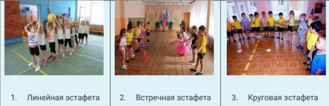 Внимательно рассмотрите фотоизображения и выберите только один вариант названия эстафеты, при которой дети передвигаются, выполняя игровые задания, до линии поворота, затем бегом возвращаются в свою команду, передают эстафету и встают в конец строя. Игра-эстафета продолжается до тех пор, пока все участники команды выполнят игровые задания.