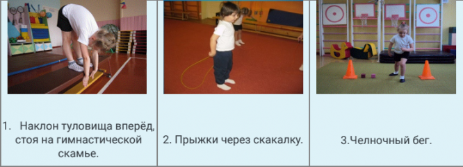 Анализ научно-методической литературы и обобщение опыта работы с детьми показывает, что основным методом диагностики физических способностей являются специально подобранные двигательные (моторные) тесты. Внимательно рассмотрите фотоизображения и выберите только один вариант названия двигательного теста, который входит в систему оценки координационных способностей дошкольников. .